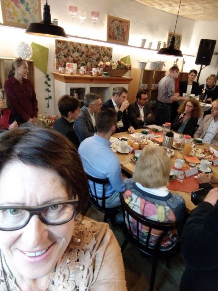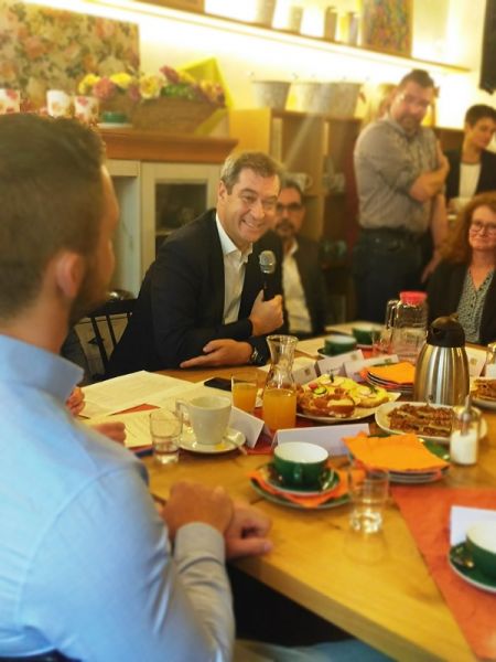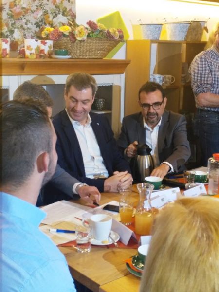 Monika Frey beim Kaffeegespräch mit Ministerpräsident Söder am 21.10.19 in Memmingen. Ein Treffen mit Bürgern aus vielen Interessensbereichen über Wirtschaft, Energie, Agrar und Soziales.